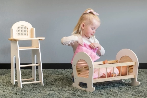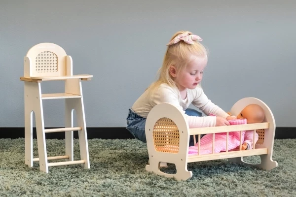 Ontdek deze prachtige houten poppenstoel en -wieg in één complete set. Perfect voor kleine poppenouders vanaf 3 jaar! Geschikt voor poppen tot 42 cm en ideaal voor urenlang fantasierijk speelplezier. Laat de pop gezellig plaatsnemen in het comfortabele stoeltje (27x24x56,5 cm), voorzien van een handig opklapbaar plateau. Perfect voor het voeden of samen spelen! Na een drukke speeldag kan de pop heerlijk rusten in de bijpassende wieg (46x33x33 cm). De wieg wordt geleverd met schattig roze geruit beddengoed. Deze leuke houten met rotan poppenset is een stijlvolle en praktische toevoeging aan elke poppenhoek!