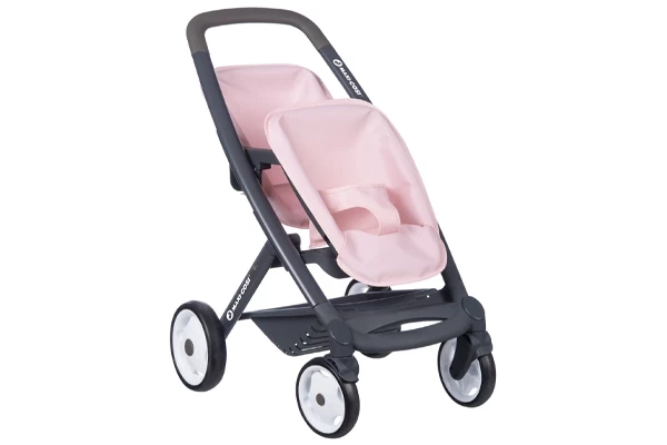 Op pad met twee poppen tegelijk! In deze handige tweeling poppenbuggy is dit geen probleem. De poppen zitten achter elkaar in de comfortabele zitje. Deze kun je overigens verstellen, waardoor de poppen naar voren of naar achteren kunnen kijken. De buggy is geschikt voor poppen tot 42 cm. De duwstang heeft een vaste hoogte van 65 cm, waardoor hij geschikt is voor kinderen vanaf 3 jaar. Door de zwenkwielen rijdt het wagentje van Smoby lekker soepel.